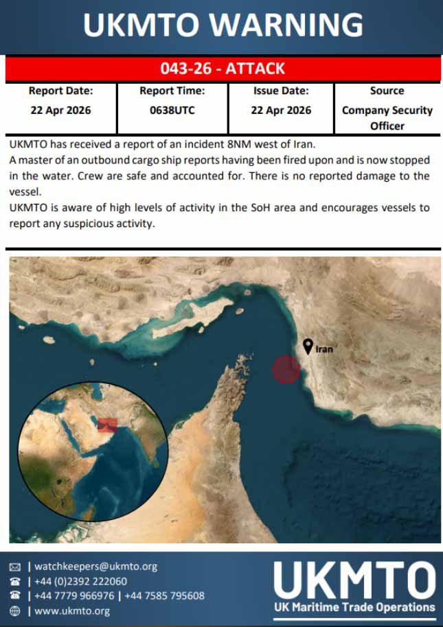 A cargo ship was fired upon about eight nautical miles west of Iran,the UK Maritime Trade Operations (UKMTO),a British navy shipping monitor,said.