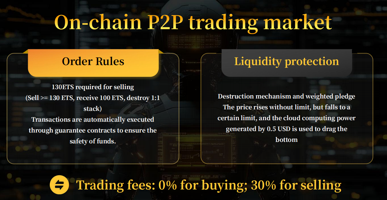The overall architecture of ETS is deployed on the BSC chain, fully supporting smart contract deployment, cross-chain interaction and dynamic deflation execution. The platform contains three layers of technical logic: basic layer (public chain and wallet support), application layer (DAPP operation interface), and contract layer (destruction, mining, P2P matching contracts). This design enables ETS to not only have good technical flexibility and modular expansion capabilities, but also quickly connect to regulatory standards and payment interface requirements in different regions, laying a solid foundation for its positioning as a "global payment infrastructure".