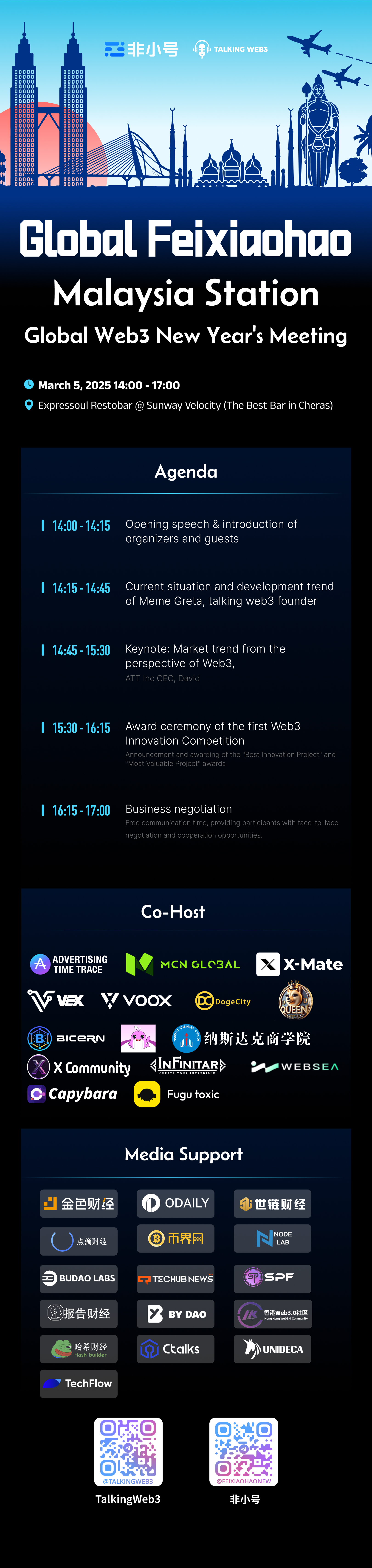 On March 5, 2025, the Feixiaohao Global Tour | 2025 Web3 New Year Meetup will be grandly held at Sunway Velocity in Malaysia! Co-hosted by Feixiaohao, Talking Web3, and Nasdaq Business School, this event will focus on global Web3 development trends, bringing together industry leaders, top projects, investment institutions, and community representatives to discuss the latest opportunities and challenges in areas such as AI-driven crypto trading, RWA (Real World Assets) digitization, Meme economy, GameFi, and DeFi.