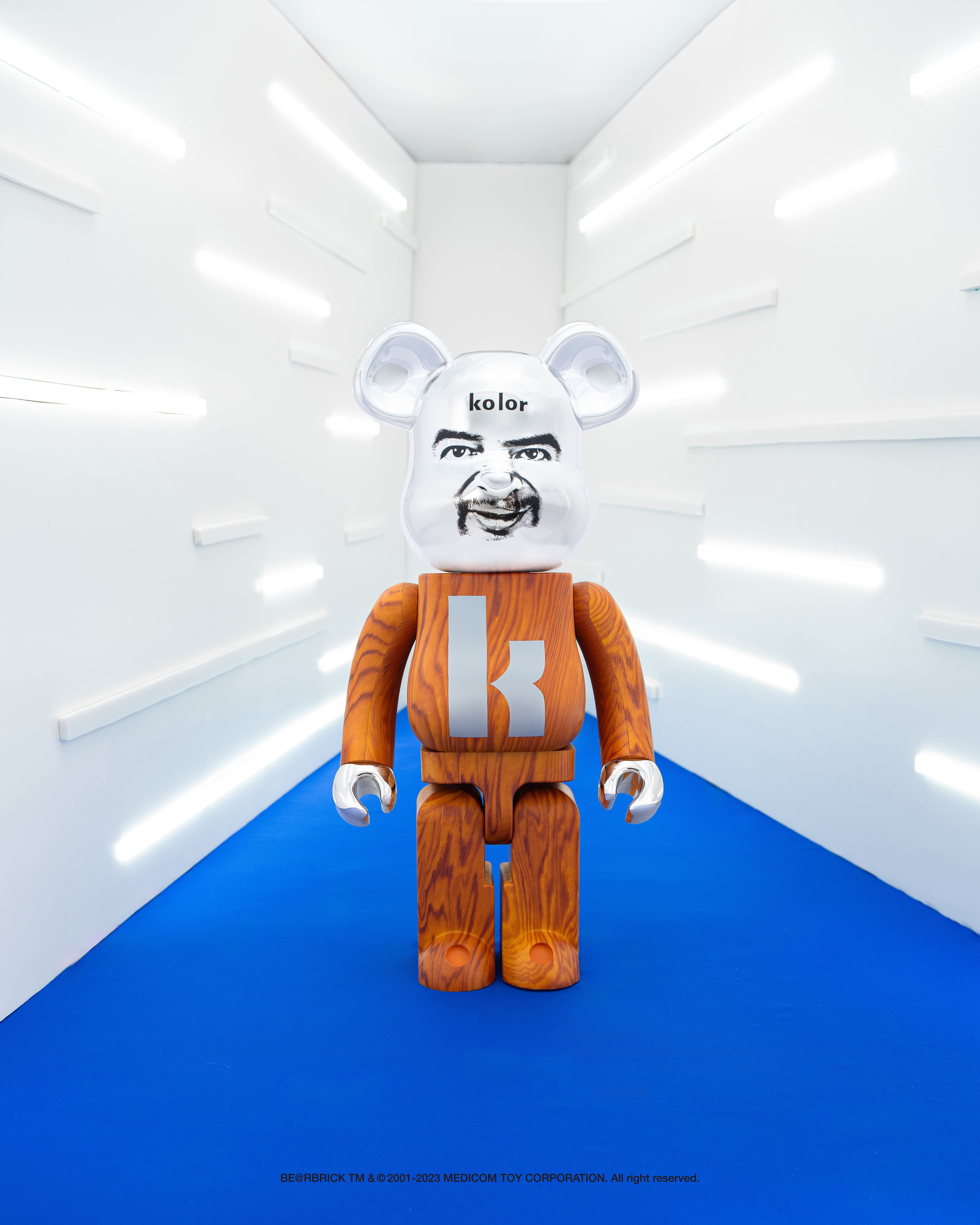 This extraordinary BE@RBRICK collaboration with Kolor by Junichi Abe highlights the striking combination of a futuristic mirrored metal and vibrant wooden elements. The face infuses a frisky touch with sketched facial expressions, adding a sense of humor and mischief to the entire piece.