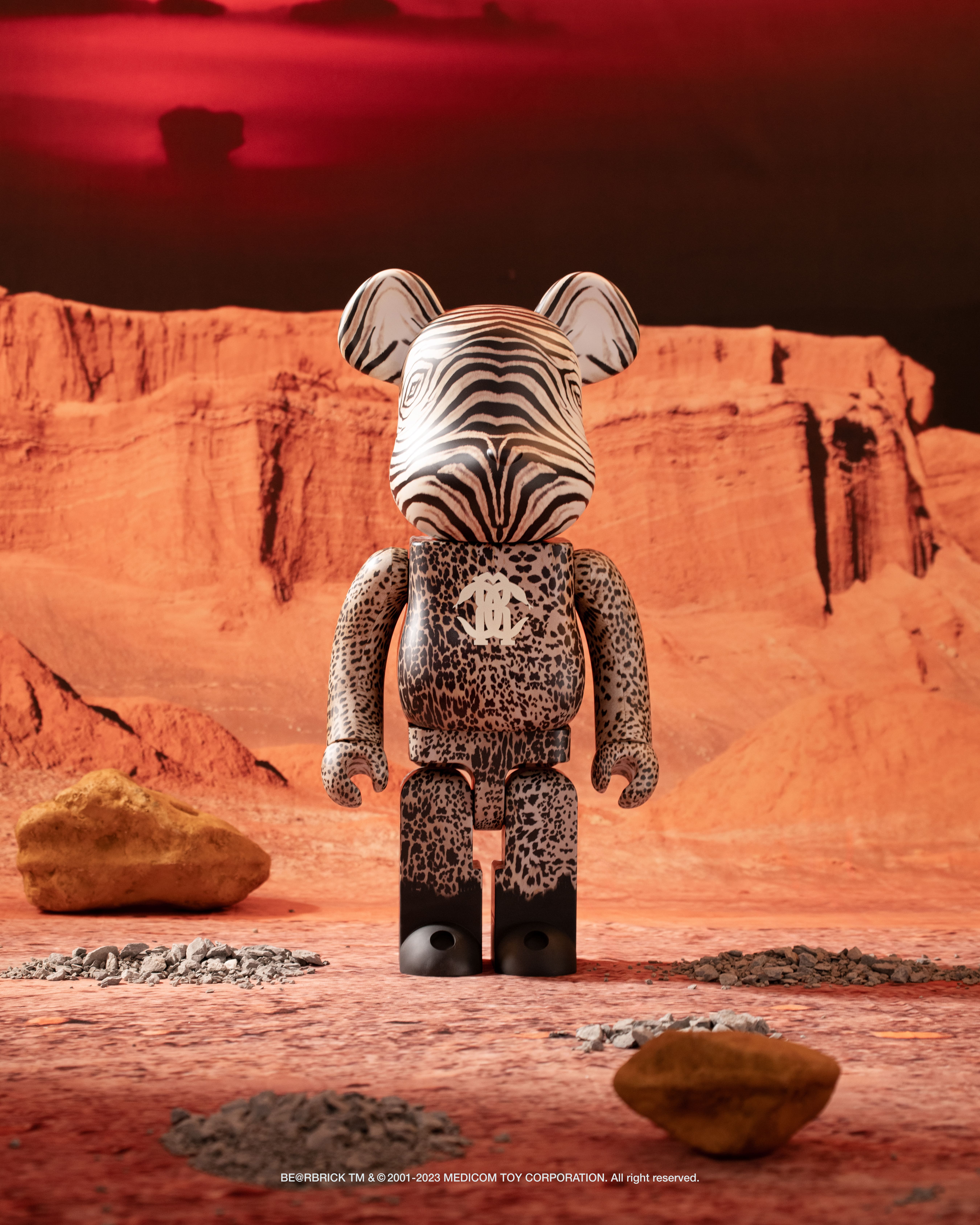 This BE@RBRICK designed in collaboration with Roberto Cavalli is a rich tapestry brimming with animal patterns. It features stripes resembling a tiger for the head and sleek spots reminiscent of a leopard on the body. The design unravels the opulence and impeccable craftsmanship synonymous with Roberto Cavalli.
