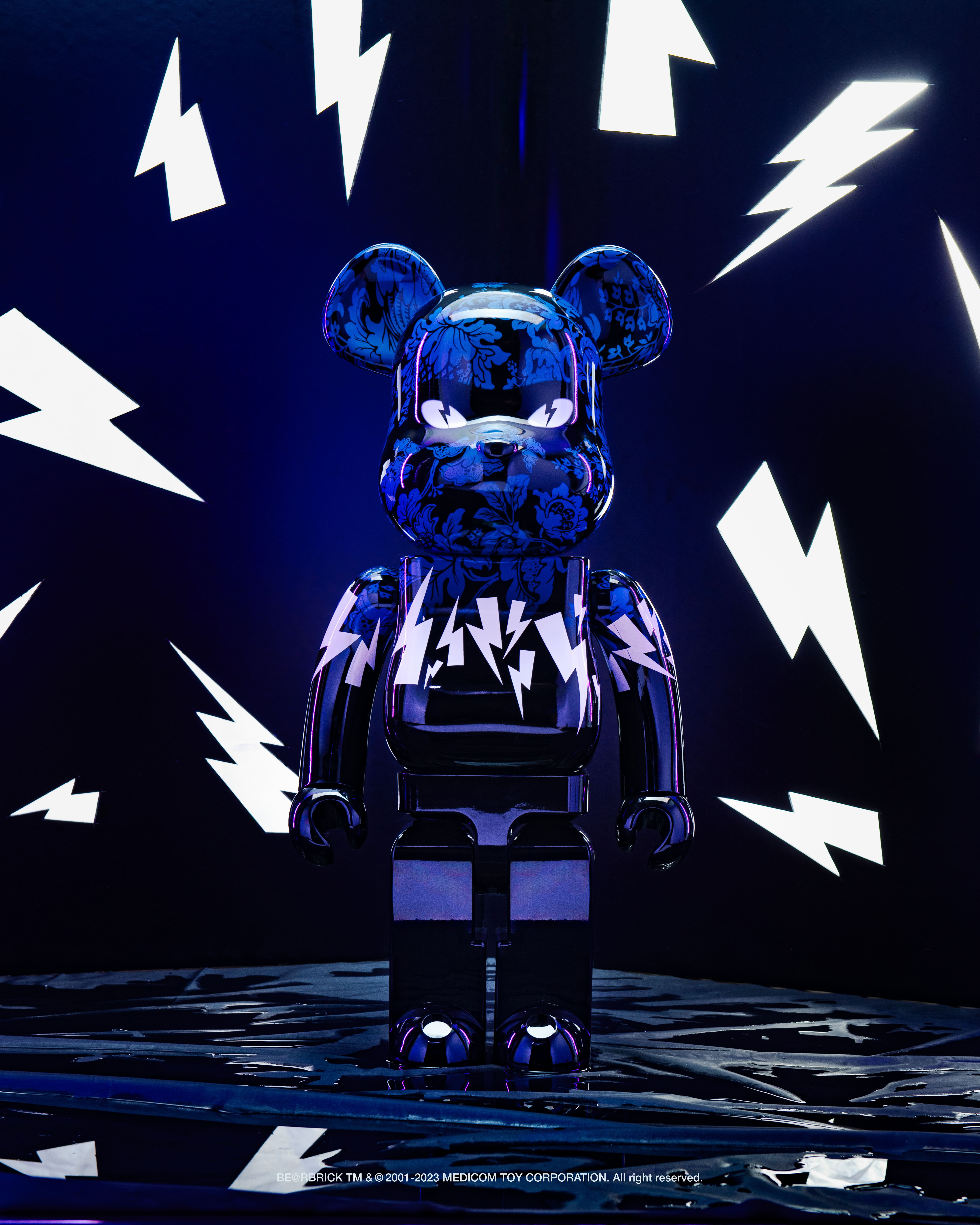 As the fifth BE@RBRICK collaboration with Neil Barrett, this design follows the brand's iconic striking lightning bolt framing the body— reminiscent of previous designs. This year, it embodies a blue botanical print intertwined with glimpses of ninjas' eyes that uncover a fanciful story.