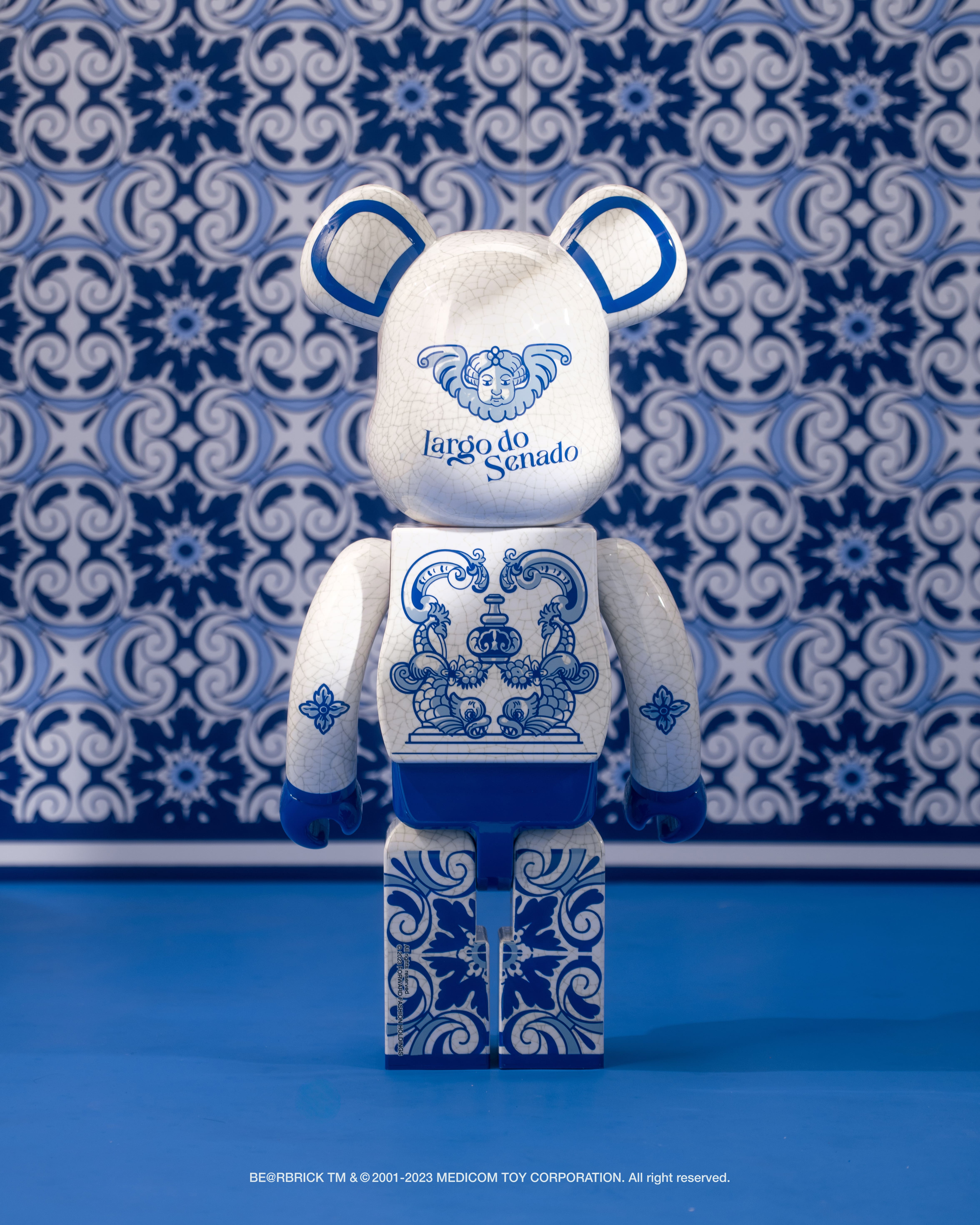 This Senado Square BE@RBRICK captures a collision of east and west, embracing ancient Chinese ceramic motifs that symbolize the convergence of forward-thinking aesthetics and time-honored traditions. On the face, Stella Maris (The Star of the Sea) emerges as a representation of hope for the people of the sea. The celestial globe on the front chest depicts the maritime explorations and historical connection between Portugal and Macau. The bottom part of the piece features a decorative pattern reminiscent of azulejo panels, a traditional architectural ornament of Portugal. The fish motifs within the panel design hold symbolic significance, representing the water as a means of preventing fire and providing a sense of security and well-being. This iconic BE@RBRICK serves as a testament that marks the historical ties and exchange between the two cultures.
