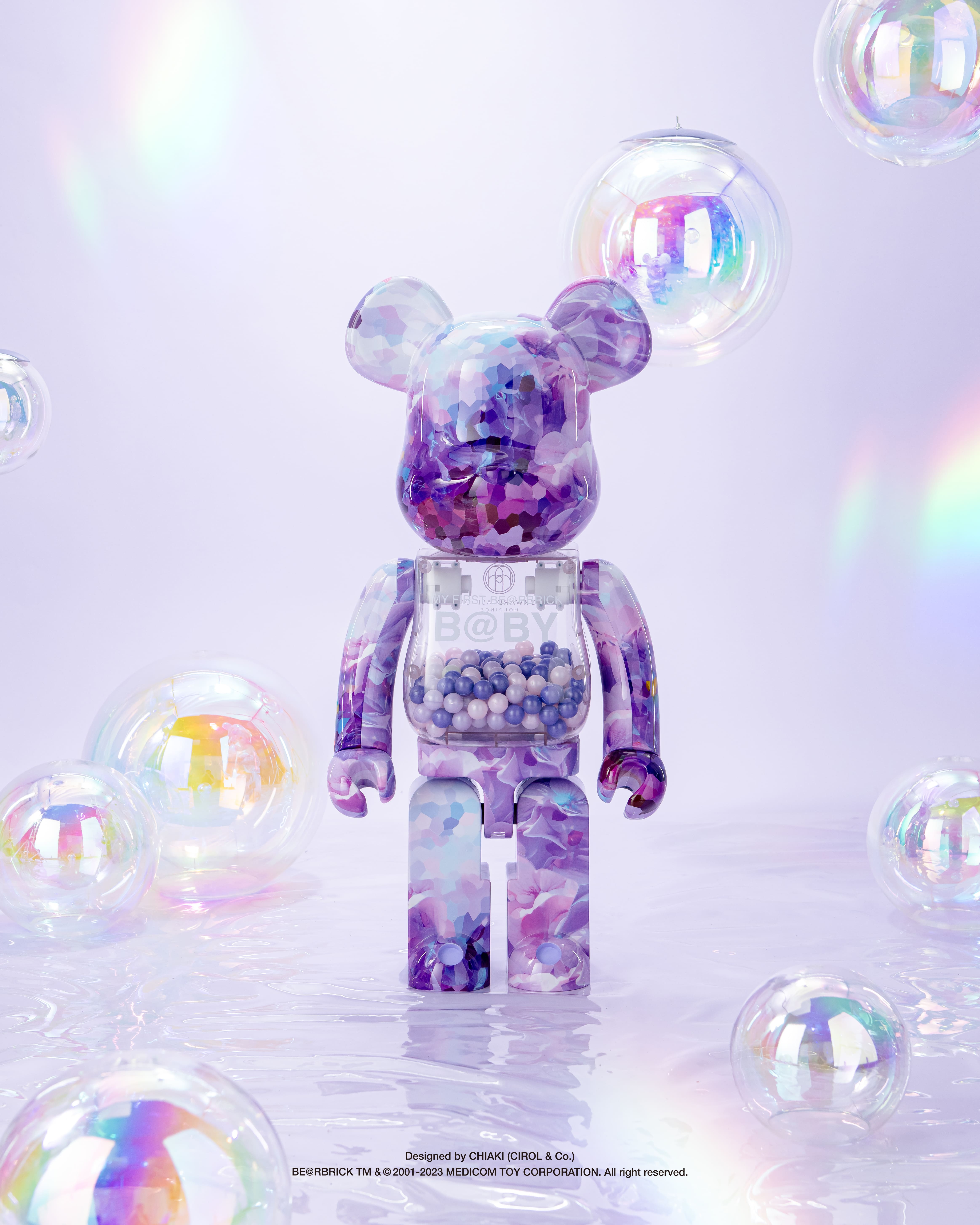 This mesmerizing "MY FIRST BE@RBRICK B@BY" is a collaboration piece with renowned artist Chiaki. It depicts a vibrant summer garden in Tokyo, adorned with “Mangekyo”, a variety of Japanese hydrangeas in shades of pink and purple. As light dances upon its surface, the figure shimmers with an iridescent brilliance—beholding a moment frozen in time.