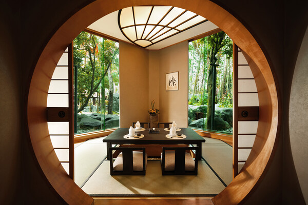 The traditional Japanese seating,combined with a serene view of the lush garden,creates a peaceful ambiance that transports guests into a Zen-like setting. Large windows allow natural light to fill the space,enhancing the connection to nature,while the calming garden view serves as the perfect backdrop for savoring exquisite Japanese cuisine in a private,relaxing environment.