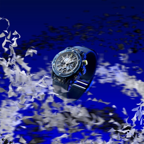 The composite that makes up the case and bezel of the watch is made of Epoxy resin reinforced with quartz powder and glass veil that has been fused with the recycled racquets and shirts. The resulting material is speckled with fragments of light & dark blue textiles and black carbon to create a singular camo aesthetic. An innovative approach,representative of Hublot's ambition for endless reinvention.