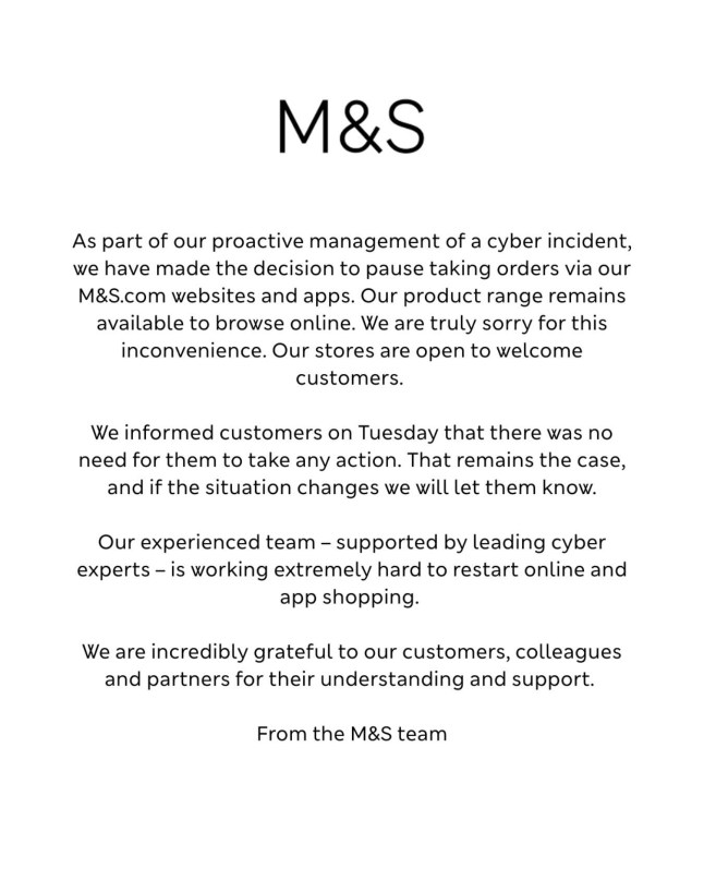 The latest M&S statement on their cyber attack (Picture: Marks and Spencer)