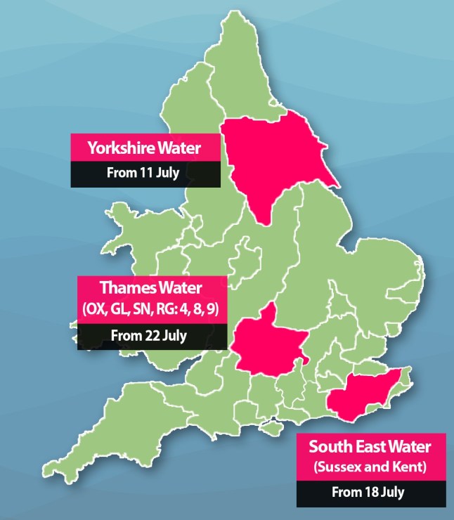 Areas of the UK where hosepipe bans are currently in place (Picture: Metro.co.uk)