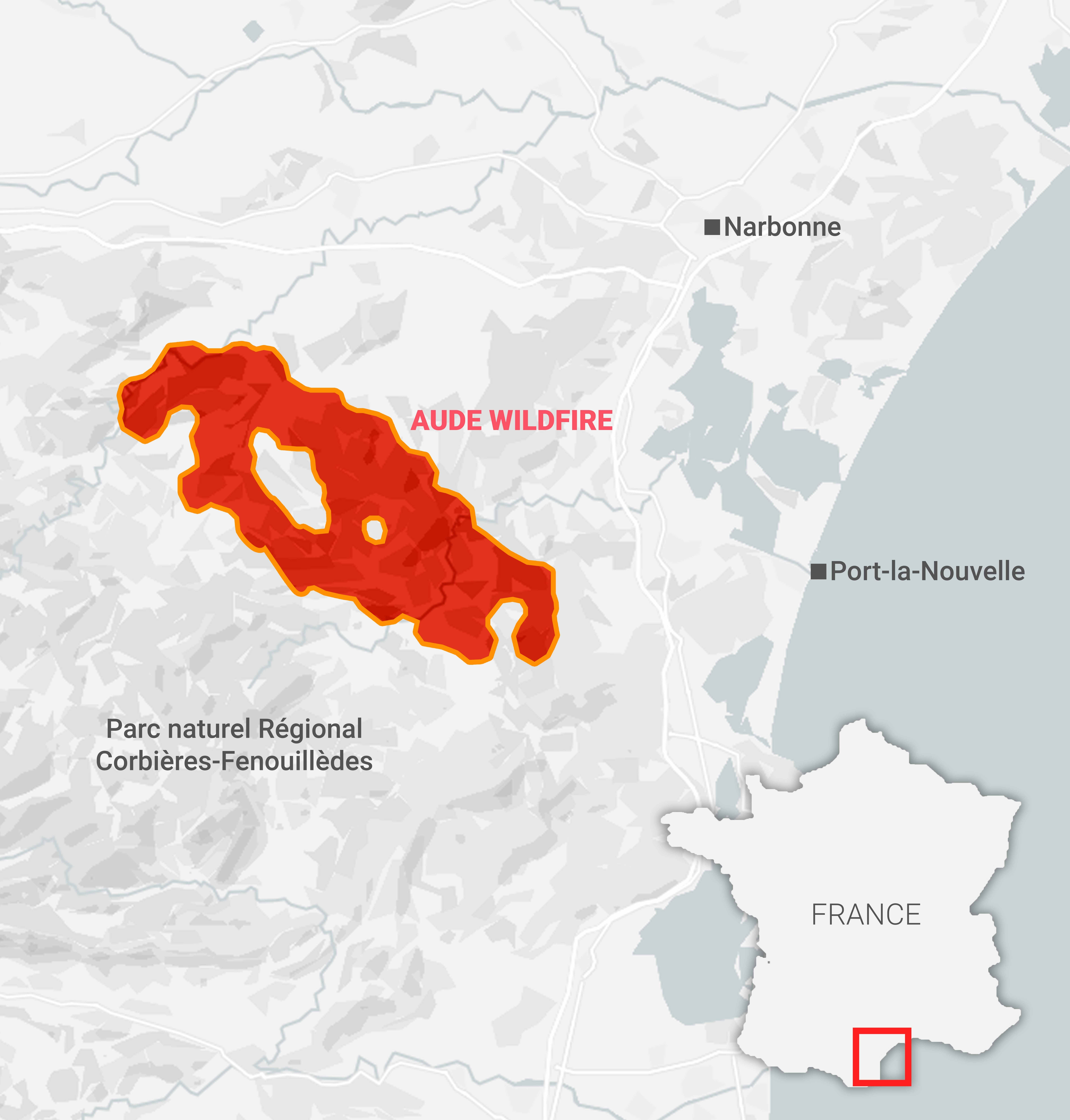 The blaze started on Tuesday and tore through the Corbieres Massif,a mountain range in the Pre-Pyrenees located in the Aude region.
