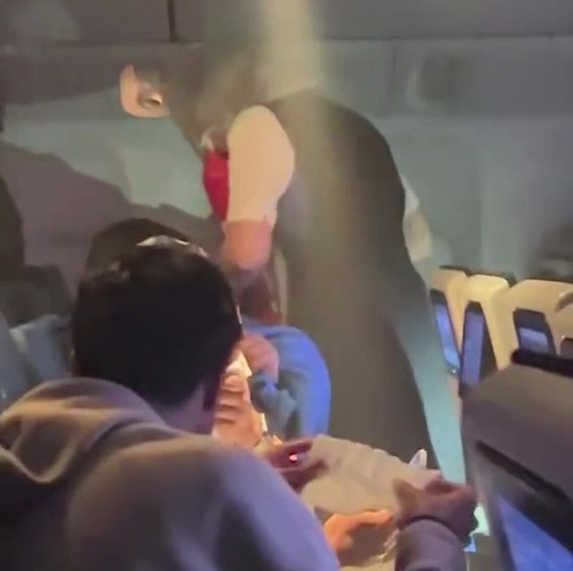 Cabin crew attend to passengers wearing smoke hoods and carrying fire extinguishers (Picture: Viral Press)